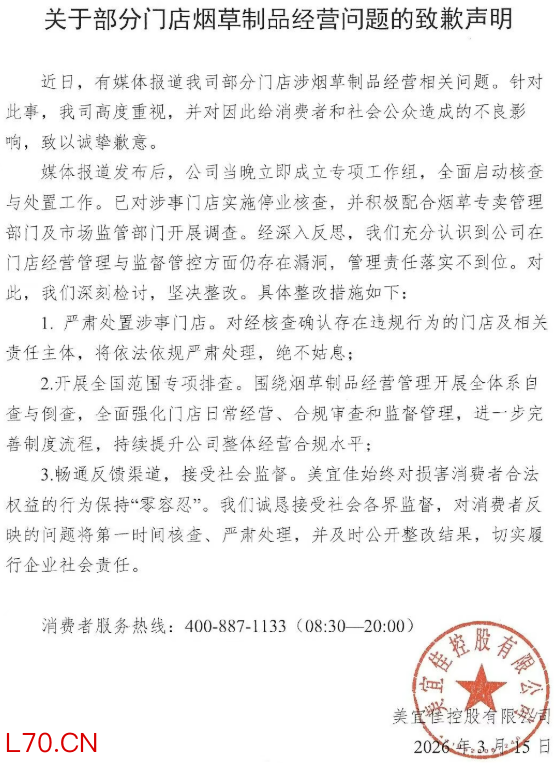 美宜佳就部分门店被曝卖假烟致歉:严处涉事门店,开展专项排查