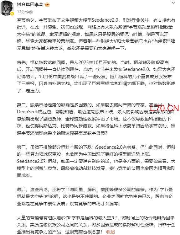 抖音集团李亮:炒作“字节是恒科的最大空头”很荒唐也很恶意
