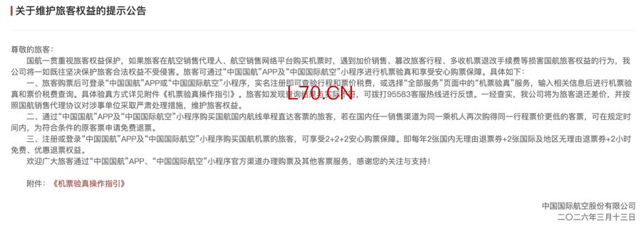 旅客购票后可登录“中国国航”App或“中国国际航空”小程序,实名注册即可查验行程和票价税费。如发现查询结果与实际不符,可拨打95583客服热线进行反馈。一经查实,国航将为旅客退还差价,并按照国航销售代理协议对涉事单位采取严肃处理措施。
